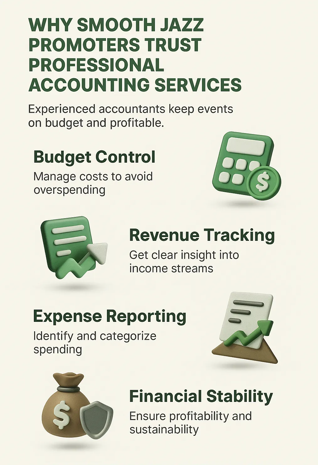 Smooth jazz promoters know that a successful event depends on more than great music — it depends on financial clarity. Managing ticket sales, sponsorships, venue fees, and unpredictable expenses requires more than basic bookkeeping. Without professional accounting support, even well-planned festivals risk falling out of tune.